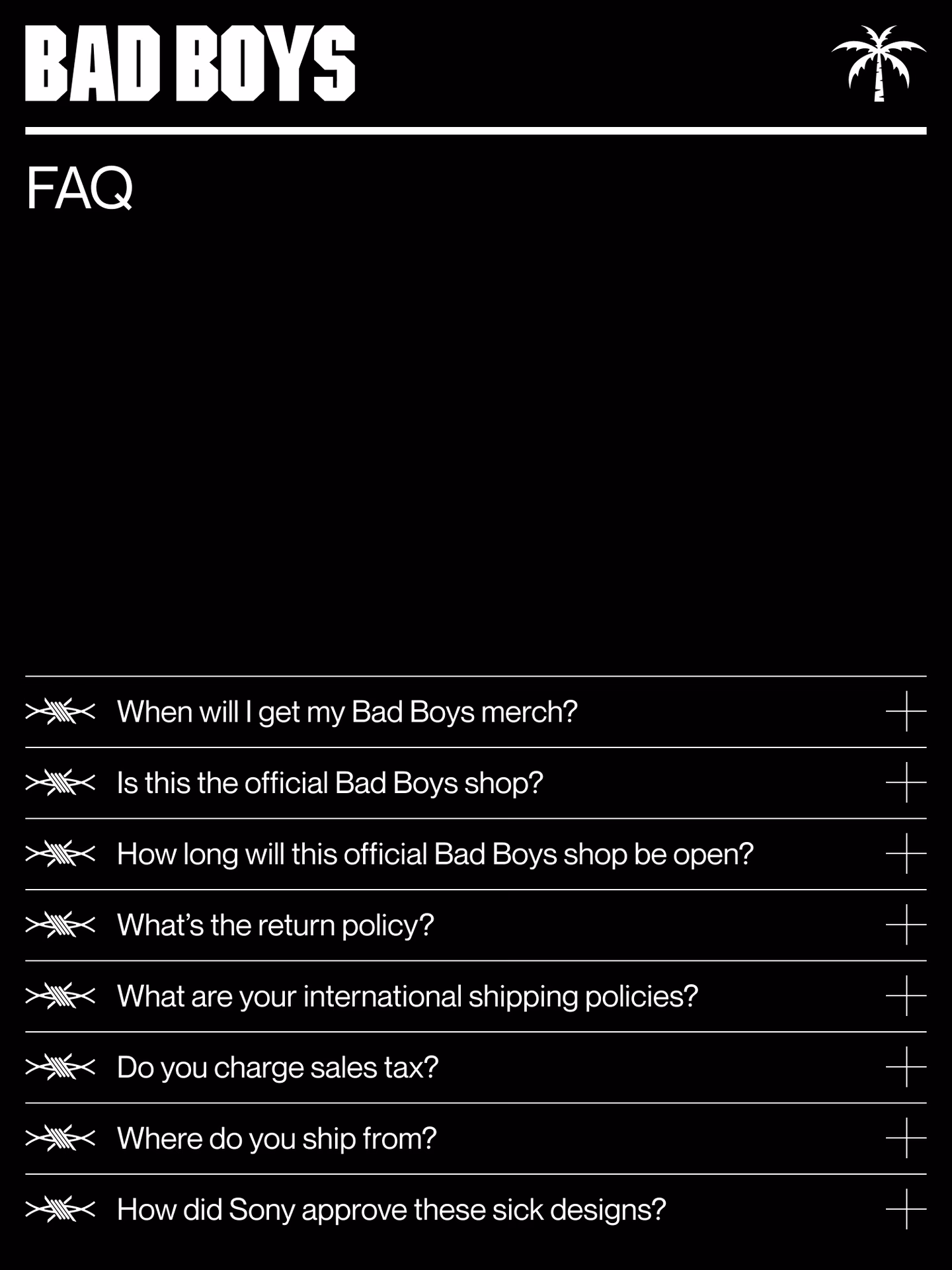 The store itself is just as in on the joke. The cursor is crosshairs. The FAQ answers questions in a bullet list, where every bullet is an actual bullet. And tucked into the footer, hovering over the BB4L icon spins the cursor like helicopter blades — click it, and you get the original Bad Boys theme. Whatcha gonna do.